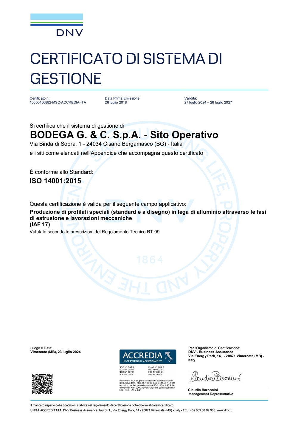 Il Sistema di Gestione per la Qualità di BODEGA G.&C. S.p.A. è certificato dal 1997 ed attualmente è certificato secondo la norma ISO 9001:2015 dall'Organismo DNV GL Business Assurance.
